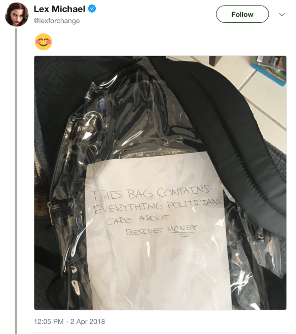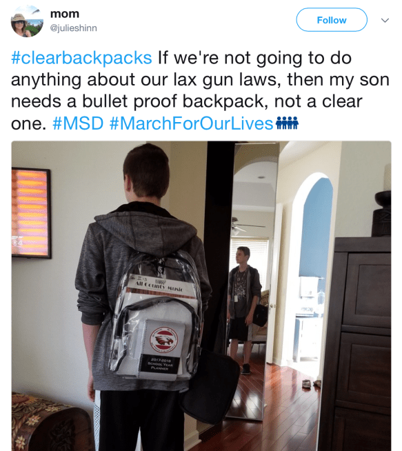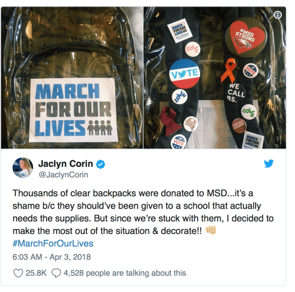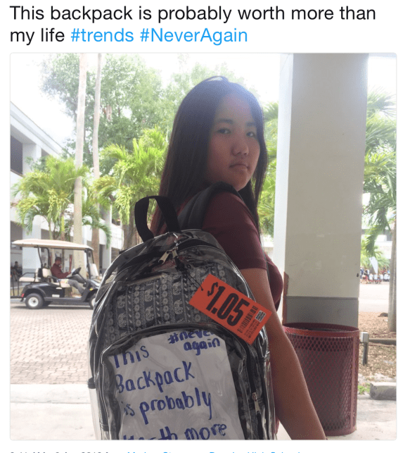 The Parkland High students have recently been given clear plastic schoolbags to ‘keep them safe’. The idea is that no one can hide a gun in a clear bag (um, they could just put another bag inside it, surely. Doh!) The students are not happy about this pathetic gesture, not to mention the invasion of their privacy (tampons!), and have decorated the bags to express their displeasure.